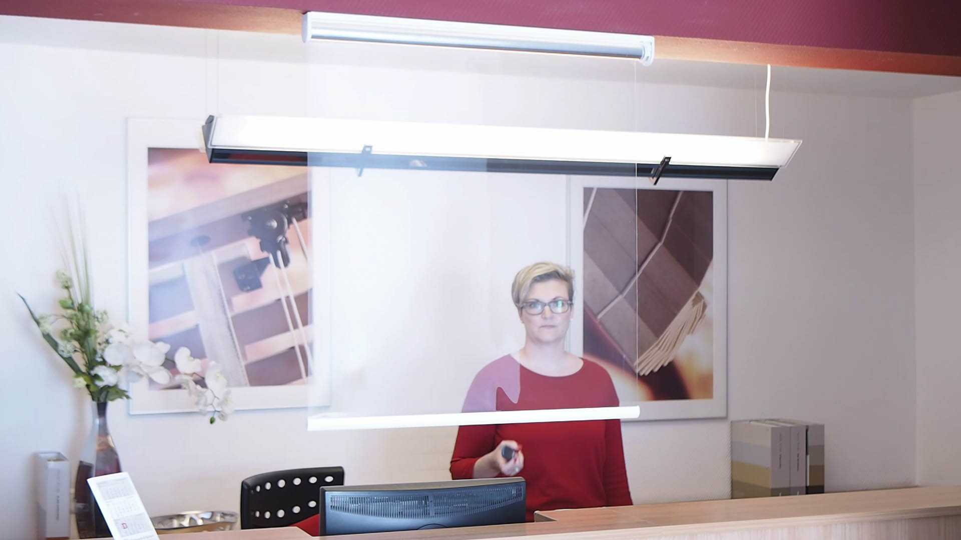 Der transparente Behang des Hygienerollos wird zwischen den Gesprächspartnern heruntergelassen und bildet so eine wirksame Barriere, welche die unmittelbare Übertragung via Tröpfcheninfektion verhindert.